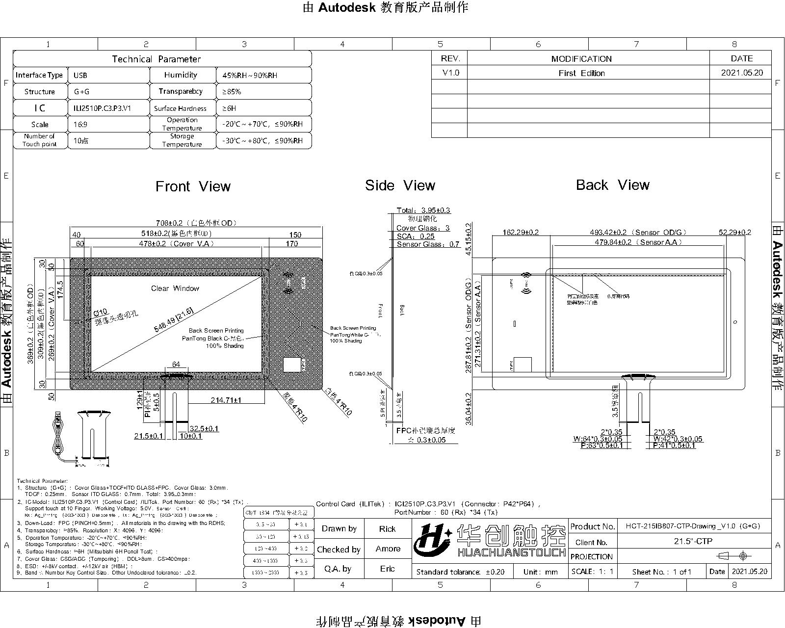 • 21.5寸非標定制觸摸屏
